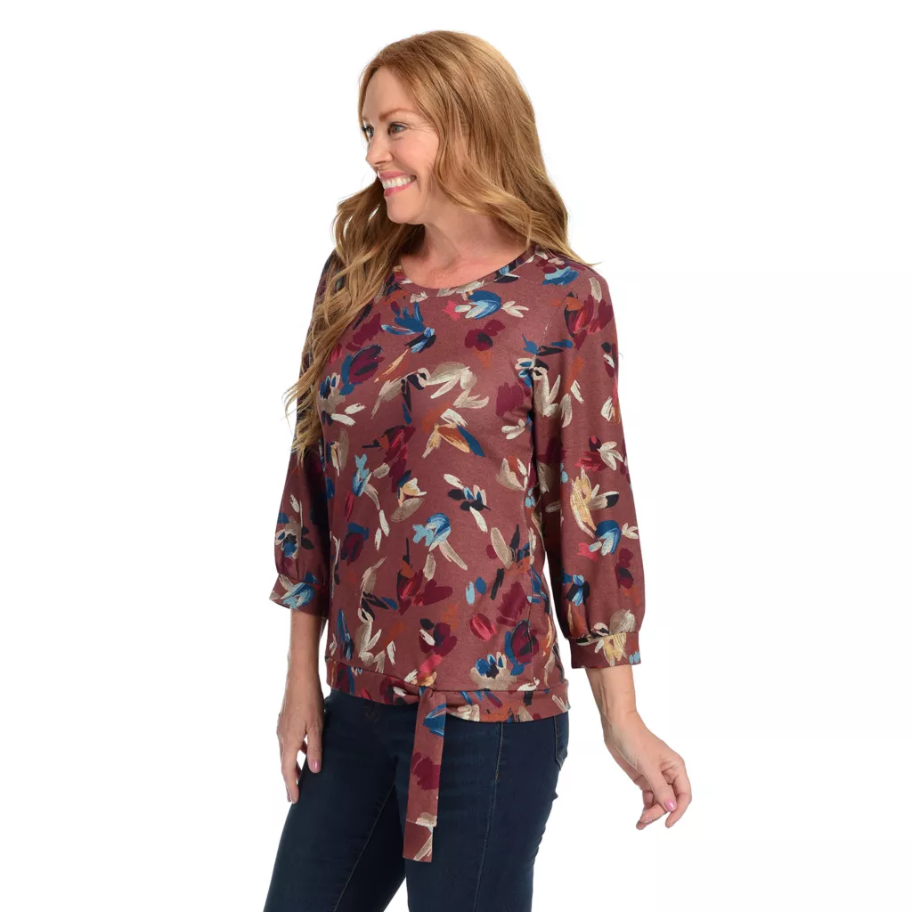 Spice up your closet with this fun, style-packed top. Super-breathable velvety to the touch material will keep you comfortable while you put your best fashion foot forward. Front hem tie and banded sleeves create a flattering silhouette for apple-picking and dinner dates alike!