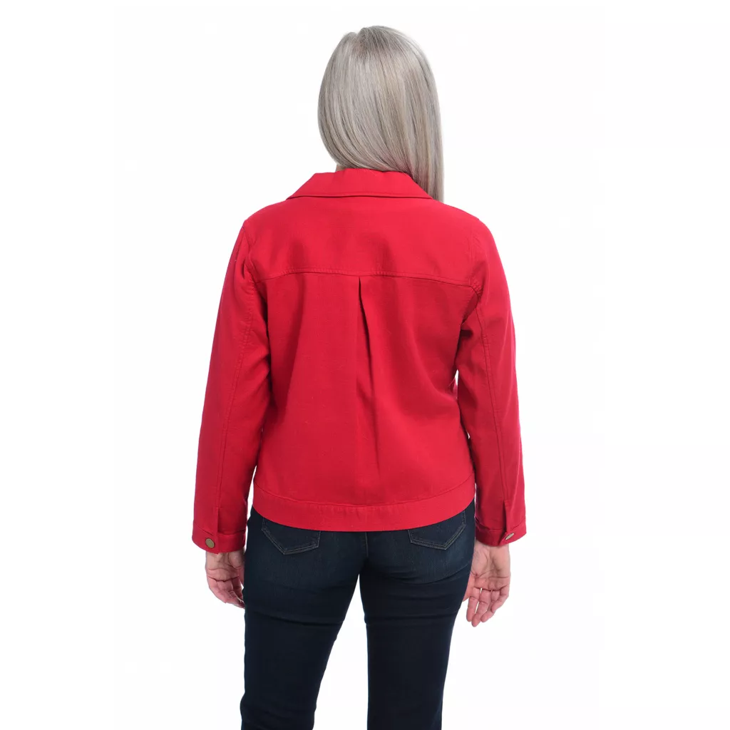 The all-season cotton jacket your wardrobe needs. 4 functional pockets and seaming details make this over piece stylish and useful. Brushed silver-finish buttons add a polished finishing touch! Layer over sweaters and tees for year-round comfort.